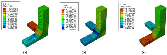 In geometry A for the CTC loading case and the scenario I: (a) Strain field in the x-direction; (b) strain field in the y-direction; (c) strain field in the z-direction.