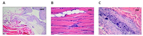 Microscopically assessed image of the site of implantation and the surrounding transverse striated muscles taken from animals with implants, 50× magnification: (A) margin, 50× magnification hematoxylin–eosin staining (scale bar 200 µm). Visible fibrotic connective tissue capsule with a slight inflammatory path; (B) transverse striated muscle 100% × magnification (scale bar 100 µm), hematoxylin–eosin staining visibly clear and significant inflammation with histiocyte foci and histiophagocytosis; (C) margin, 50× magnification (scale bar 100 µm), hematoxylin–eosin staining, visible resorptive reaction containing large dark multinucleated cells inside the connective tissue scar.