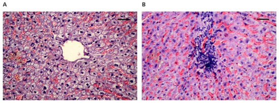 Microscopically assessed image of the liver from the implanted animals: (A) 100× magnification (scale bar 100 µm), hematoxylin–eosin staining; (B) 100× magnification (scale bar 100 µm), hematoxylin–eosin staining.