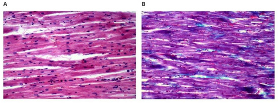 Microscopically assessed image of the heart muscle obtained from implanted animals: (A) 100× magnification (scale bar 100 µm), hematoxylin–eosin staining magnification; (B) 100× magnification (scale bar 100 µm), Masson’s staining.