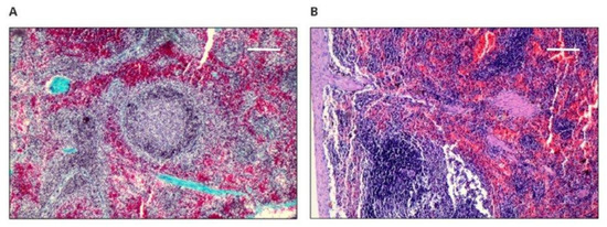 Microscopically assessed image of the spleen collected from animals with implants: (A) 50× magnification (scale bar 200 µm), Masson’s staining, white pulp; (B) 50× magnification (scale bar 200 µm), Masson’s staining, red pulp.