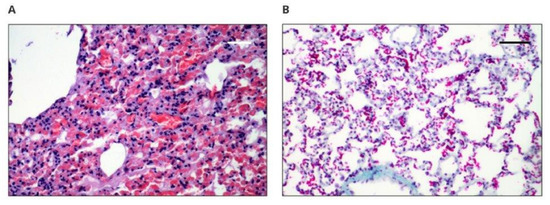 Microscopically assessed image of lungs collected from animals with implants: (A) 100× magnification (scale bar 100 µm), hematoxylin–eosin staining; (B), 50× magnification (scale bar 200 µm), Masson’s staining.