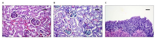 In the histopathological examinations of the kidneys, the renal glows (Figure 7A,B), the urethra, and the pelvis (Figure 7C) did not reveal any pathological changes, including glazing or extensive glomerular fibrosis, the presence of a crescent, intraurethral rollers, or pelvic fibrosis.