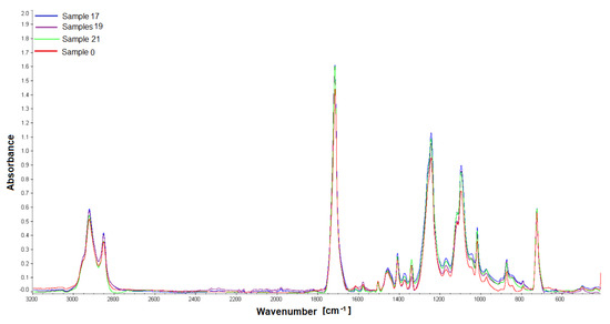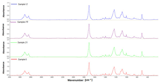 FTIR spectra of the studied PET-DLA 65 copolymers: sample 0-not implanted, sample 17, 19, 21 after 12-week implantation period.