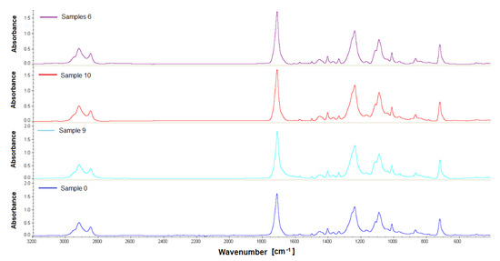 FTIR spectra of the studied PET-DLA 70 copolymers: sample 0-not implanted, sample 6, 9, 10 after 12-week implantation period.