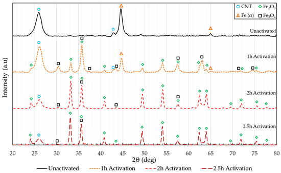 XRD analysis was performed to determine the effects of thermal activation on crystalline phases in the CNT pulp. The diffraction pattern of the unactivated and activated CNT pulp is revealed in Figure 2. The unactivated CNT pulp consisted of primarily two phases, sp2 carbon arranged as tubular structures composed of rolled-up graphene sheets (CNT), and iron. As the activation time increases, the iron catalysts suffer progressive oxidation; FeO is not detected in the samples activated for 1 h and is likely to only be present only during the initial steps of the reaction, instead, Fe3O4 and Fe2O3 peaks are identified. From 1 h to 2 h, the reflections corresponding to metallic iron completely disappear. The reflections of iron (II, III) oxide (Fe3O4), and iron (III) oxide (Fe2O3) dominate the pattern, with a marked reduction in the intensity of the peaks corresponding to Fe3O4 and increase of the Fe2O3 reflections as the activation time increases. After 2.5 h the iron catalyst has almost fully oxidized to iron (III) oxide.