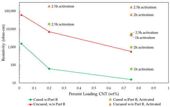 The resistivity of cured and uncured CNT consisting of unactivated and activated CNTs.