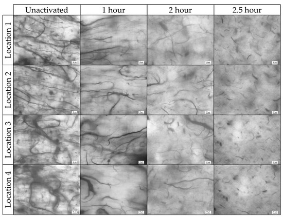 Optical microscopy from four locations in unactivated, 1, 2, and 2.5 h activated CNT pulp. The scale bar is 10 µm with individual panel widths being 143 µm.