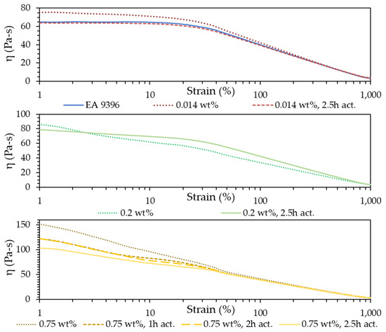 Measured viscosity as a function of strain for 0.014, 0.02, and 0.75 wt% CNT loadings with different activation times.