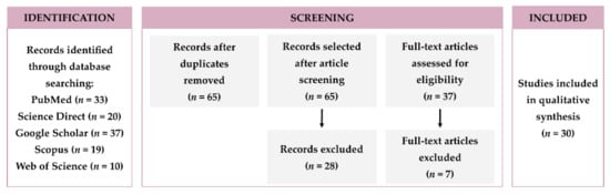 Based on the applied research strategy, 119 articles were found, including 33 articles in PubMed, 20 articles in ScienceDirect, 37 articles in Google Scholar, 19 articles in Scopus, and 10 articles in Web of Science. After duplication analysis, 54 studies were eliminated, leaving 65 articles. Inclusion and exclusion criteria were applied, removing 28 articles that did not meet the research requirements. After full-text article evaluation, 7 were excluded by lack of information or corresponding to a hydrogel formed by the NPs themselves, rather than NLH, leaving 30 articles for the qualitative synthesis. This methodology is summarized in Figure 1.