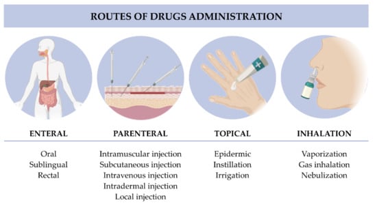 The administration route determines the effectiveness of the treatment and depends on the drug characteristics, biomedical application, and patients’ compliance. The routes of drugs administration are classified as enteral, parenteral, topical, or inhalation (Figure 3) based on the drug’s administration site.