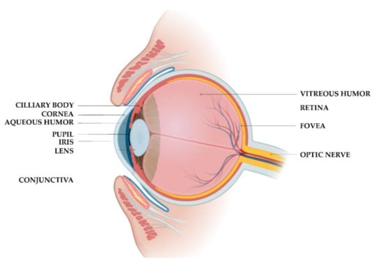 Due to eye complexity (Figure 4), eye barriers, and their physiological functions, the conventional ocular administration of drugs has several shortcomings in terms of low bioavailability and reduced activity due to a low permanence and permeability at the target site [].