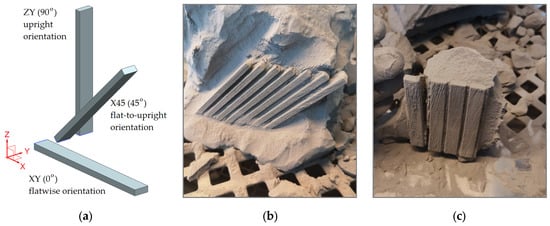 Designed and processed specimens: (a) CAD models defining the three build orientation; (b) X45 (flat-to-upright) processed specimens; (c) XZ (upright) processed specimens.