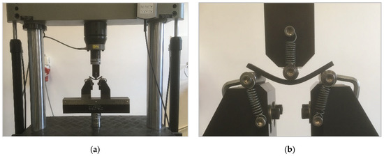 The three-point bending tests were performed at room temperature using a dual column closed-loop Multipurpose Servohydraulic Universal Testing Machine, type LVF 50-HM (Walter–Bai A.G., Löhningen, Switzerland) equipped with a loading cell of 50 kN capacity (see Figure 2a).