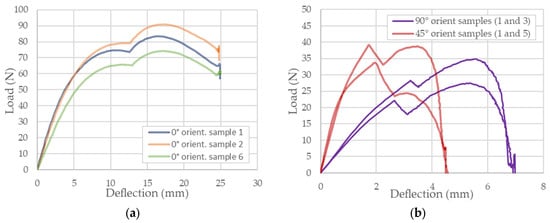 A completely different response was exhibited by the specimens built with 45° flat-to-upright and upright orientation (see Figure 3b). That is, the 45° flat-to-upright specimens display a load-softening behavior with a primarily nonlinear elastic ascending branch up to the first flexural cracking load (equal to an average of 35 N reached at a deflection about half the specimen thickness). At this point, a sudden drop of load occurs (of 10% to 30%), followed by a slightly ascending post-elastic step region with all subsequent load values smaller than the first critical one. Then, a final descending trend until the final fracture (occurring at an average deflection value less than 5 mm) closes the curve. On the other hand, the upright specimens show a typical load-hardening behavior, with an initial nonlinear elastic ascending branch up to the first cracking load (equal to an average of 30 N at a deflection value which equals about the specimen thickness), identified through a slightly sudden drop of load (of 5% to 10%), followed in a first instance, by an ascending post-elastic region with a maximum load higher than the first critical one. Subsequently, it decreases smoothly until the final bending fracture (corresponding to an average deflection of 7 mm).