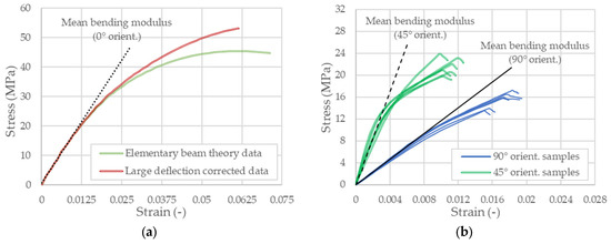 Figure 4b shows all the three-point bending stress-strain curves obtained for both 45° flat-to-upright and upright specimens. Since the strains are typically minor, no differences exist between the elementary beam theory results and those based on the large displacement formulation. However, a significant difference in the stiffness response can be observed, with a lower value but a minor deviation from linearity up to the fracture onset in the case of upright oriented specimens compared to the specimens built with 45° flat-to-upright orientation.