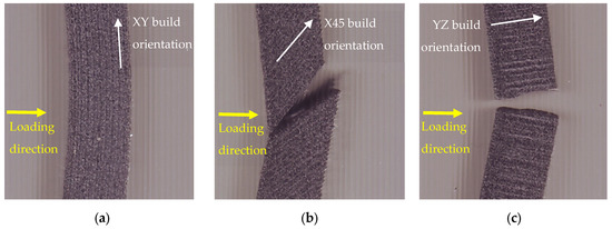 As for the three-point bending tests performed on flatwise build orientated specimens indicated in Figure 5a, it is worth noting that no fracture was observed in these specimens, even for excessive deflections. Such a non-breakability was not reported so far; nonetheless, some dissimilarities against the data reported in literature could result from different printing parameters. More remote, all the specimens having 45° flat-to-upright and upright building orientation underwent a much smaller deformation at failure, indicating a reduced ductility and a fracture plane that follows the layerwise microstructure of the two involved printing directions (see Figure 5b,c).