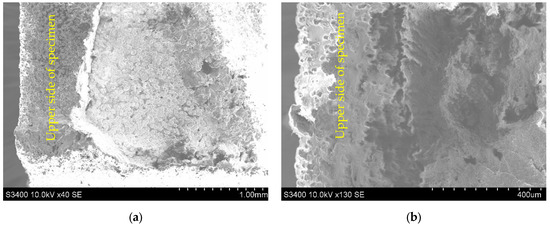 SEM image on the lateral side of a flatwise oriented specimen at the midspan length: (a) tension (bottom) area; (b) compressed (upper) area.