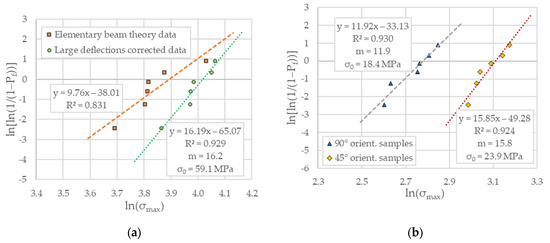 where n returns the total number of tested specimens for a given build orientation, and i is the position of the test specimen after they were ranked by increasing the magnitude of bending strength. The standard calculation procedure is to regress linearly the data against the values of (bending strength). Thus, by plotting the left-hand side of Equation (A3) against , would lead to a straight-line fit of data, with the slope m and the intercept ln[V/].