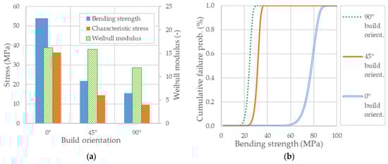 The Weibull moduli and the values of characteristic strengths obtained through the linear regression analysis are shown in Figure 8. The best-fit straight lines with the slightest errors measured on the ordinate axis return the data necessary to evaluate failure probabilities for each additively manufacturing build orientation in question.