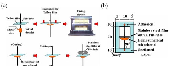 To check the interfacial bonding strength between carbon fibers and colored epoxy resins, IFSS was obtained by performing a microdroplet debonding test using colored epoxy resins according to pigment concentrations (0.1, 0.3, 0.5 and 1.0 wt%) on carbon fibers (Hyosung). Prior to this study, in order to analyze the interface characteristics between the fiber and the resin, an experiment was conducted as shown in Figure 1 to analyze the difference in the interface characteristics depending on the shape of the resin. After passing a single fiber through a Teflon film with a hole of about 30 μm, the fiber was fixed to a metal frame for fixing the fiber. An initial droplet was formed using a thin metal wire and the Teflon film was lowered slightly downward to form the droplet into a hemispherical shape.