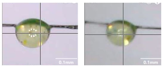 The pressure was applied in the direction of the central axis of the fiber at the 10 μm area of the x-axis, where the tensile stress was converted into the compressive stress, thereby suppressing the interfacial fracture of the droplet specimen (Figure 7).