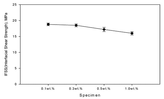 The IFSS showed a tendency to decrease as the concentration of the pigment increased, and the specimen containing 1.0 wt% was measured to be the lowest at 16 MPa. However, when the pigment was 0.5 wt%, the decrease in IFSS was relatively lower than that of the pigment added at other concentrations. It was considered that the pigment acted as an impurity in the epoxy resin, and the interfacial bonding strength was lowered. Based on these experimental results, it was determined that 0.5 wt% of the pigment concentration of the epoxy resin was the optimal condition.