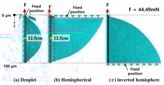 The finite element numerical analysis model of the three models used is shown. Since all three models had an embedding length of 100 μm and a 25 μm pinhole was used for the droplet model, the contact position between the epoxy droplet and the pinhole was modeled to be 12.5 μm at the center of the fiber axis. In the hemispherical model, the pinhole contacted the upper horizontal plane of the test piece, so modeling fixed the horizontal plane in the Z-axis direction. In the inverted hemispherical test piece, the lower part of the resin was fixed by modeling because the vise tip came into contact with the stainless thin plate fixed to the lower part of the test piece. In addition, all three models were set to non-fixed fiber axis r direction and axisymmetric conditions. The load acting on the upper part of the fiber shaft was 44.49 mN, which was the average measured value of the interfacial fracture load of the hemispherical test piece with an embedded length of 100 μm prepared under the curing conditions, and this value acted on the cross-sectional area of the fiber. The physical properties of the fibers and resins were applied by applying the values used in the previous research and, based on this, the textile fibers were modeled with general-purpose finite element analysis software, and the physical properties derived from the physical properties were obtained and reflected.