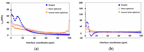 Figure 6 and Figure 7 are simulation results for the interfacial bonding force of carbon fiber/colored epoxy resin. Droplet models display higher interfacial fracture loads than other models. It was also shown that the inverted hemispherical model, unlike the other two models, had a large increase in tensile stress near z = 100 μm. After that, shear-type interfacial fracture progresses were seen on the side surface of the fiber. Based on such a stress distribution phenomenon, the stress mode change and the rapid increase in stress at the interface between the fiber and the resin greatly differed depending on the model type, and the data variation in the interface shear strength evaluation of the fiber composite material was very large.