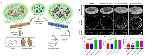 Chuchao Zhou et al. [] synthesized collagen–GO scaffolds containing apatite (GO-Col-Ap) with increased osteoconductivity and biocompatibility for bone regeneration in cranial defects in rats. The functionalization of the protein with the carbonaceous nanostructure provided multiple active sites for the biomimetic mineralization process due to the numerous oxygen groups present on the basal plane. Composite scaffolds with high porosity and interconnected pores were synthesized through a crosslinking process by using carbodiimide chemistry (EDC/NHS). The deposition of apatite in the scaffold was investigated through micro-CT images, which showed that the apatite mainly attached to the surfaces of the GO–collagen-based scaffolds, rather than within the porous structures (Figure 2).
