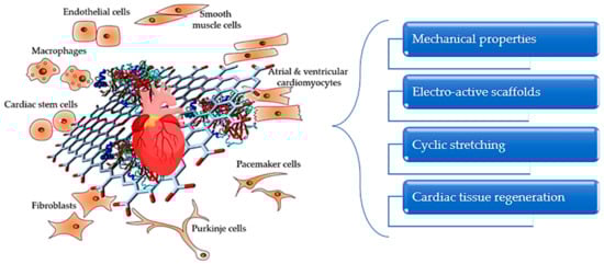 GO possesses ideal electrical, mechanical, and biological properties for integration as an active nanomaterial for the development of cardiac scaffolds, as presented in Figure 3 [,]. The myocardial extracellular matrix is mainly composed of collagen fibers []; thus, biomaterials synthesized from collagen and its derivatives, such as gelatin, can be successfully used for the development of various substrates to enhance cardiac tissue regeneration.