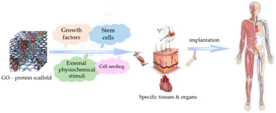 Tissue engineering represents an interdisciplinary domain that involves the development and fabrication of new biomimetic materials with a similar structure and configuration to those of the extracellular matrix, the aim of which is to stimulate and sustain the regenerative mechanism through cell proliferation and differentiation in order to create new tissue. The development of new materials with a similar structure and configuration to those of natural tissue has become of great importance in the field of tissue engineering, and thus, GO–protein bioconjugates have recently drawn researchers’ attention as a potential formulation that can successfully fulfill the requirement of regenerative medicine. Table 1 summarizes the latest applications of bionanocomposites based on biomacromolecules and GO in the field of tissue engineering.