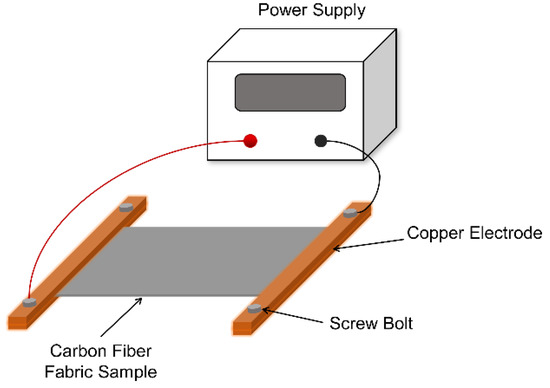 In this study, polyacrylonitrile (PAN)-based carbon fiber fabric (T300B-CO6343B), purchased from TORAY Company, Japan, was employed as the raw material. In order to reduce the contact resistance between the carbon fiber fabric and the copper electrodes, a thin layer of conductive silver adhesive (DS-5510, D-MAX Technology Co., Ltd., Shenzhen, China) with a width of 15 mm was coated on both ends of the carbon fiber fabric sample. The size of the carbon fiber fabric sample and the coating position of conductive silver adhesive are shown in Figure 1. The schematic diagram of the SRE heating platform for carbon fiber fabric is displayed in Figure 2. The power supply used in this study is KEITHLEY 2260B-30-108 (Tektronix Inc co., LTD, Beaverton, OR, USA), with maximum voltage of 30 V. In the experiment, the current loads applied to the carbon fiber fabric were 0 A, 12 A, 16 A, 20 A and 24 A, respectively, and the electrify time was 240 s. The infrared thermal imager (ImageIR 8300, InfraTec GmbH, Dresden, Germany) was used to monitor the temperature change of carbon fiber fabric under SRE heating. Figure S1 shows the temperature field distribution of carbon fiber fabric under SRE heating with the current intensity of 12 A, 16 A, 20 A and 24 A. As seen, the surface temperature of carbon fiber fabrics under the electric intensity of 12 A, 16 A, 20 A and 24 A at steady stage are 158 ± 2.9 °C, 212 ± 3.2 °C, 270 ± 4.9 °C and 332 ± 5.4 °C, respectively.