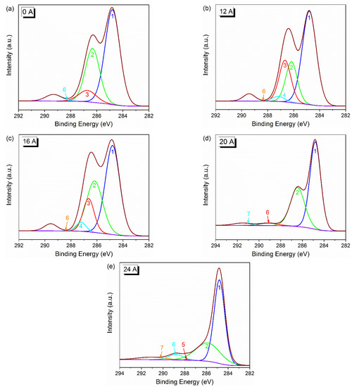 Deconvolution of C 1s XPS spectra of the CF surface: (a) untreated, (b) 12 A/240 s, (c) 16 A/240 s, (d) 20 A/240 s and (e) 24 A/240 s.