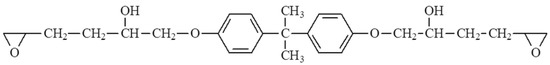 The high-resolution spectra of C 1s were deconvoluted to further analyze the functional groups on the CF surface. Figure 4 shows the detailed deconvolution results of the C 1s. As seen, there are seven potential carbon-containing component with bonding energies of: 284.6 eV (-C-C-), 286.1 eV (-C-OH, -C-O-C- and -C-NH2), 286.6 eV (C-O-C epoxy groups), 287.2 eV (-C-OR), 287.5 eV (-C=R), 288.9 eV (-COOR, -COOH), 291.1 eV (π-π) [18,25,26]. Especially, as suggested by reference [18], the peak at 286.6 eV is attributed to an epoxy group. It can be understood that the main ingredients of sizing for T300B fiber are bisphenol A epoxy resin and amino compounds, as reported by [27]. Herein, the activated carbon atoms (carbon atoms conjunct with oxygen and nitrogen) concentration is introduced to represent the chemical reactivity of the CF surface. The relative amount of surface functional groups, the activated carbon fiber atoms concentration, and the value of B.E. are listed in Table 2. Figure 5 shows the chemical structure of E44. The C-O-C epoxy group in the third column of Table 2 refers to the epoxy group with triangular structure at both ends of E44 molecular formula, while the C-O-C in the second column is not a triangular epoxy structure. As seen, the C-O-C epoxy group on the CF surface decreases to 0 after SRE heating at 20 A, which illustrates that the epoxy sizing on the CF surface would degrade after SRE heating with stronger current intensity. The decrease in the activated carbon atom concentration can also verify this, while peak 2 and peak 6 exhibit a weak change when current intensity increases from 16 A to 20 A (or 24 A). Besides, π-π appears when the current intensity reaches more than 20 A. Because the CF precursor is composed of disordered graphite microcrystals arranged in two-dimensional order along the fiber axis, the appearance of π-π can prove that the CF precursor is exposed after the sizing agent on the CF surface is decomposed [28,29]. To sum it up, too strong of a current intensity can bring about the thermal decomposition of some sizing agents, and the reduction of oxygen content on the CF surface and the content of activated carbon atom, inhibiting the chemical activity of the CF surface.