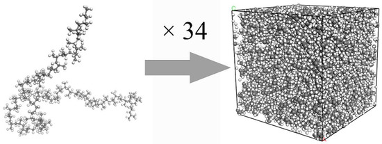 As shown as Figure 6, 34 PP chains formed the PP layer in a square box with dimensions of 5.4 nm (length) × 5.2 nm (width) × 6.4 nm (height). The degree of polymerization was 70 and density was 0.92 g/cm3. The periodic boundary of the model was set to approximate a polymers large system.