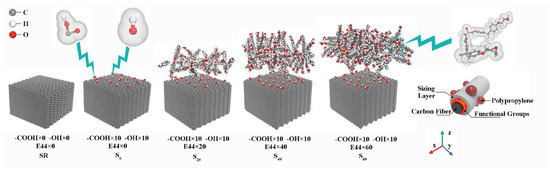 Same with our previous investigation [30], the CF model was created using 15 perpendicular graphene layers with a close-packed hexagonal structure and 0.34 nm spacing, which has the dimensions of 5.4 nm × 5.2 nm × 3.5 nm. As revealed by XPS, the sizing agent on the CF surface was epoxy compound. However, it is difficult to know the concrete sizing agent for CF. Here, taking the same approach with reference [31], the epoxy sizing of E44 was simply chosen for the CF surface in this paper. As shown in the XPS results, the sizing agent on the CF surface changes with current intensity in the form of epoxy group (C-O-C). To explore the possible effect on the CF–PP interface from this change, the number of E44 of different CF layers was set as 0, 20, 40 and 60, respectively, and the corresponding interface models of composites are called S0, S20, S40 and S60 for short, as shown in Figure 7. XPS results show that hydroxyl and carboxyl groups exist on the CF surface under different current intensities. However, the percentage of carbonyl group is relatively low (max.0.2%) compared with other functional groups. Besides, Uematsu et al. [32] found that the difference of 10% in the content of C=O is a minor factor in the interfacial adhesion between PA6 and CF. Furthermore, the complexity of MD model requires high computational resources. Thus, the influence of carbonyl groups was not considered in the MD simulation. According to the research of Jiao et al. [31], the surface grafting rate was set as 6.06% and ten hydroxyl and carboxyl groups were introduced on the CF surface.