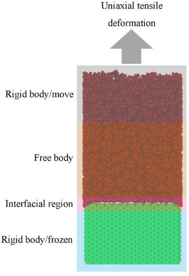 After the equilibration stage was completed, the tensile deformation was carried out to study tensile mechanical properties and failure mechanism of the CF–PP interface. The method of the tensile deformation simulation is shown in Figure 9. The top layer of the PP and the CF layer were set as rigid bodies, respectively, and the atoms in other areas of the system were kept free. Under the NVT ensemble with the temperature of 100 K, the temperature of the interface separation process was controlled by using the nose Hoover thermostat. The rigid body of the top polymer was displaced continuously for 100 ps at a fixed speed of 0.1 nm/ps along the positive direction of the Z axis.