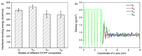 (a) Interfacial bonding energy and (b) density distribution along z axis of CF/PP composites.