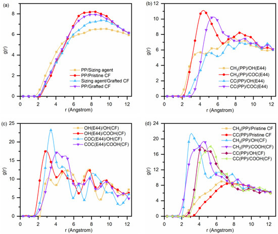 In order to deeply understand the effects on bonding mechanism between CF and PP from chemical properties of CF surface, the radial distribution function (RDF) was used to further analyze the CF–PP interface at the last frame of the equilibration process. The RDF describes the probability density of the existence of another molecule in a system at a distance of from any molecule. It can be expressed as [33]: