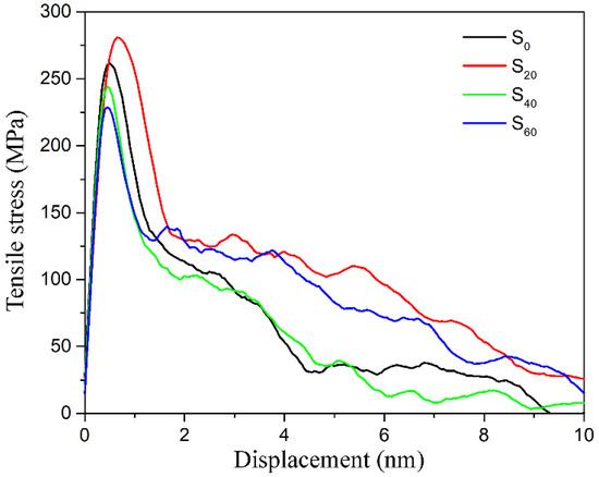 The tensile stress-displacement curves of different models (Si) under uniaxial tensile loading are shown in Figure 12. The curves exhibit three classical regions during the whole tensile deformation process, namely, elastic, yield and softening stages. When the number of E44 molecules is 20, the interfacial tensile strength reaches the highest value, namely, 280.94 MPa, which is nearly 7.4% higher than that of the S0 model without the sizing agent and only grafting functional groups on the CF surface. When the number of E44 molecules increases to 40 and 60, the sizing agent layer covers the CF surface completely, but the interfacial tensile strength decreases, which is 244.25 MPa and 228.73 MPa, respectively. This trend is the same as that of the interfacial bonding energy, which further verifies that the sizing agent is not conducive to the interfacial property. According to the RDF analysis, the sizing agent has weaker ability to attract the PP, compared with CF. To some extent, the connection between the CF and PP is blocked by the sizing agent. However, a thin sizing agent cannot weaken the interfacial strength. On the contrary, irregular physical morphology of the sizing agent enhances the mechanical interlocking. A thick sizing agent layer can block the interaction between the CF and PP completely. Therefore, the sizing agent with appropriate thickness can increase interfacial tensile strength of CF/PP composite.