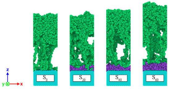 The failure mechanism of the CF–PP interface system is the competition between the CF–PP interface and PP, and the different competition pattern can create three failure modes. They are adhesive failure, cohesive and adhesive mixed failure and cohesive failure. Figure 13 and Figure 14 clearly represent the interface failure position and tensile failure morphologies. It is the cohesive and adhesive mixed failure for S20; the failure modes for the other three models are all adhesive failures. When the stretching lasted to the 100 ps, the tail of the PP chain of S0 is completely separated from the CF surface, while some PP chains of the other three models are still attached to the surface of the sizing agent. The cause of this phenomenon may be related to the rough surface of different sizing agent layer.
