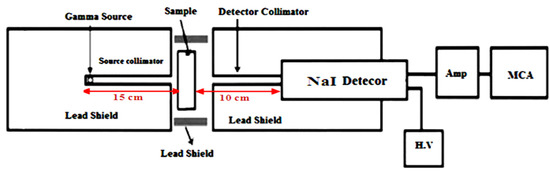 The linear attenuation coefficient (LAC) was measured for all discussed SR samples using the narrow beam technique of gamma ray spectroscopy in a radiation physics laboratory (Faculty of Science, Alexandria University, Alexandria, Egypt). The devices used in this method were the detector, collimator and radioactive point sources. An NaI (Tl) cylindrical scintillation detector with a (3″ × 3″) dimension, a relative efficiency of 15% and an energy value of Cs-137 (0.662 MeV) was used. The inner diameter of the lead collimator was 8mm and the outer diameter was 100 mm. The point radioactive sources were chosen to cover a wide range of energy, where four radioactive sources were used as follows: Am-241 (0.06 MeV), Ba-133 (0.081, 0.356 MeV), Cs-137 (0.662 MeV) and Co-60 (1.173, 1.333 MeV) [24,25,26,27,28,29]. The illustration of the experimental setup is shown in Figure 3.