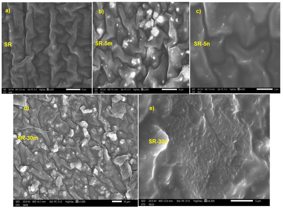 SEM images of the prepared samples of (a) SR, (b) SR-5m, (c) SR-5n, (d) SR-30m and (e) SR-30n.