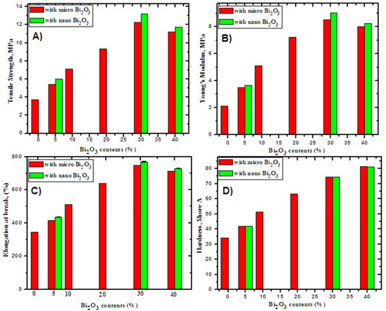 In the case of free SR, the mechanical properties (MPs) of SR composites are relatively poor. The MPs of the SR/micro- and nano Bi2O3 composites are plotted in Figure 5A–D. These figures show the variability of tensile strength, Young’s modulus and elongation at break with different concentrations of micro- and nano-Bi2O3 as fillers. The results show that increasing the filler load leads to a significant increase in the tensile strength, Young’s modulus and elongation at break of up to 30 wt%.