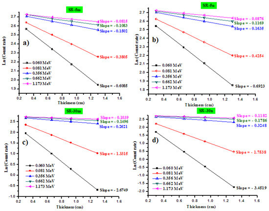 In order to obtain the linear attenuation coefficient experimentally, we represented the relation between Ln (I/I0) and the thickness of the samples, according to the Lambert–Beer law. The slope of the straight line is the absolute value of the LAC. We represent the reduction in the intensity of the photons as a function of the thickness for four samples in Figure 6a–d. In this figure, we show the results for the following samples: SR-5m, SR-5n, SR-30m and SR-30n. The other samples have the same trend shown in this figure, so we did not present the data for the remaining samples in Figure 6a–d.