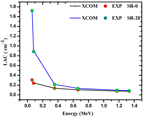 Comparison between the experimental and XCOM LAC for the SR 0 and 20% of micro-PnO.