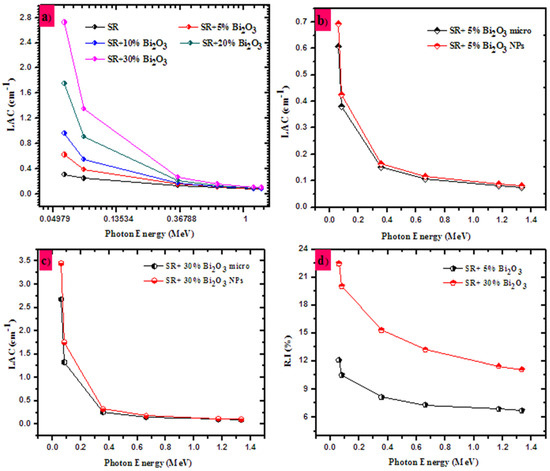 In Figure 8a, we plot the LAC for the SR and the RS with different concentrations of micro-Bi2O3 (5, 10, 20 and 30%). Using this figure, we aim to understand the influence of adding some fractions of Bi2O3 into the SR on the attenuation performance of the prepared samples. Evidently, the lowest LAC is found in the SR and the LAC progressively increases as the amount of Bi2O3 increases from 5 to 30%, where the maximum LAC is reported for the SR + 30% Bi2O3 sample. The reason for this enhancement in LAC is due to the high density and atomic number of bismuth, and it is known that adding high atomic number elements to the materials increases the probability of the interaction between the photons and the electrons in the materials. Consequently, incorporating Bi2O3 into the SR sample leads to the enhancement of the radiation protection performance.