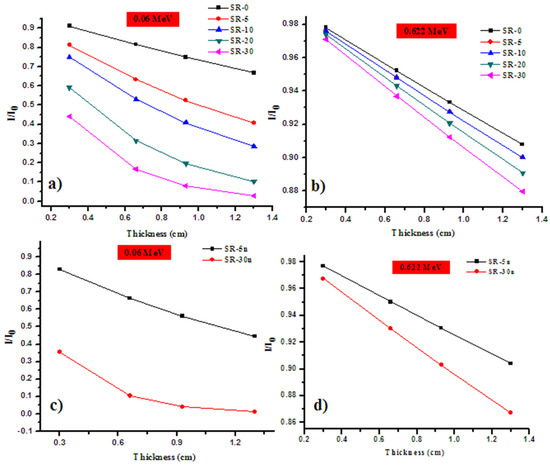 Graphical representation of the reduction in the intensity of the photons as a function of the thickness for (a) SR-5m, (b) SR-5n, (c) SR-30m and (d) SR-30n.