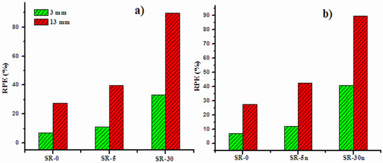 In order to understand the influence of the thickness of the prepared SR on the attenuation performance, we plotted the radiation shielding efficiency (RPE) for the SR, SR-5m and SR-30m, in Figure 10a, and SR, SR-5n and SR-30n, in Figure 10b, at the same energy value of 0.081 MeV. In both subfigures, it is evident that the RPE for the SR is less than the RPE for the SR with Bi2O3 (micro or nano sized), which reaffirms that adding Bi2O3 to the SR causes an improvement in the attenuation performance. Most importantly, we can see that the RPE for the SR with a thickness of 13 mm is higher than that with a thickness of 3 mm. This is correct for the SR incorporating micro- or nano-Bi2O3. For instance, from Figure 10a, for the SR-5m, the RPE is 10% and this is increased to 40% for the same sample with a thickness of 13 mm. Therefore, we can conclude that the thickness is an important parameter that affects the attenuation competence of the prepared SR. The high thickness SR is recommended as a good attenuator barrier. Moreover, we found that the RPE for the SR with nano-Bi2O3 is higher than that of the corresponding micro-Bi2O3.